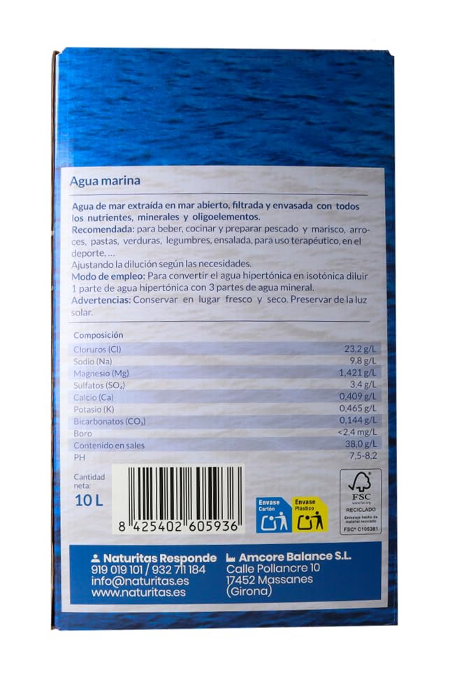 Agua Marina 10 L Naturitas Essentials | Ideal para beber y cocinar | Agua de mar | Sin aditivos | Microfiltrada en frío | Agua de la Costa Brava | En contenedor de fibra