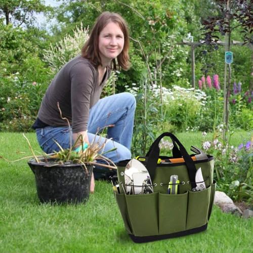 ❄【GRAN CAPACIDAD】13W * 6.7D * 12H pulgadas de gran capacidad, suficiente para almacenar varias herramientas cuando se dedica a trabajos de jardinería, el bolsillo es lo suficientemente profundo para almacenar y transportar muchas cosas, como aerosoles de niebla fina, atar plantas de jardinería y guantes de jardinería, horquillas para desmalezar, desmalezadoras, cultivadores, paletas y bolsas de almacenamiento.