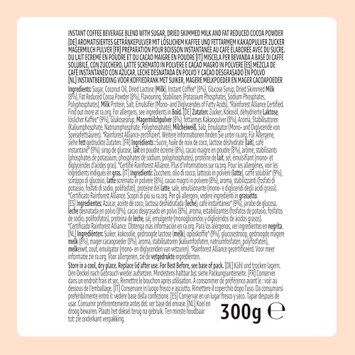 Azúcar, aceite de coco, lactosa deshidratada (LECHE), café instantáneo* (9%), jarabe de glucosa, LECHE desnatada en polvo (8%), cacao desgrasado en polvo (8%), aroma, estabilizantes (fosfatos de potasio, fosfatos de sodio, polifosfatos), proteína de LECHE, sal, emulgente (monoglicéridos y diglicéridos de ácidos grasos). *Certificado Rainforest Alliance. Obtenga más información en ra.org.Para los alérgenos, consulte los ingredientes en MAYÚSCULAS.