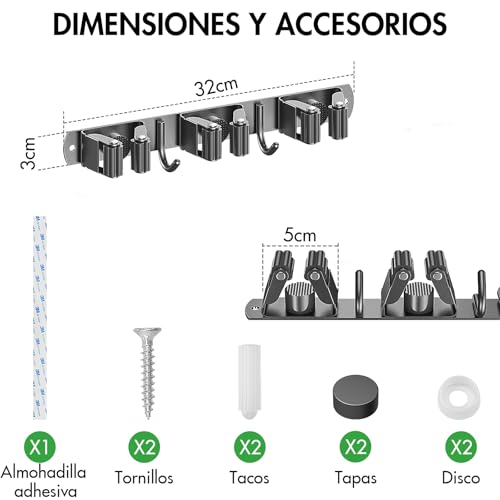 Volumen de suministro: 1x soporte para escobas con 3 soportes y 2 ganchos (dimensiones: 32cm x 4cm x 4cm); 1 x almohadilla adhesiva; 2 x tornillos; 2 x tacos; 2 x tapas; Ofrecemos asistencia 7×24 horas, si tiene alguna pregunta sobre nuestros soportes para escobas, no dude en ponerse en contacto con nosotros, le daremos una respuesta satisfactoria.