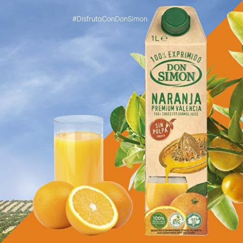 Zumo Don Simon de naranja exprimido sin pulpa. Natural y lleno de vitaminas gracias a las naranjas premium Valencia, exprimidas en sólo 24 horas. No procede de concentrado y su envase de 1 litro es ecológico.
