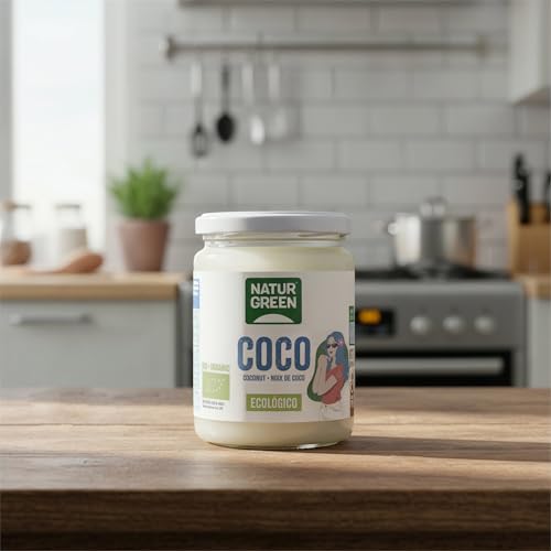 NaturGreen Aceite de Coco Virgen Bio 430 ml / 400 g, ideal para cocinar y para el cuidado cutáneo y del cabello. Es rico en vitaminas B1, B2, B3, B6, C, E y minerales como Calcio, Magnesio, Fósforo, Potasio, Hierro y Zinc. El Aceite de Coco tiene un alto contenido de ácido láurico, ácido graso que se digiere más rápido que otros tipos de grasas. Con Ingredientes procedentes de la Agricultura Ecológica. NaturGreen pfrece un aceite de coco virgen extra suave yaromático de calidad Premium, prensado en frío a partir de pulpa de cocos recién recolectados procedentes de cultivo sostenible.