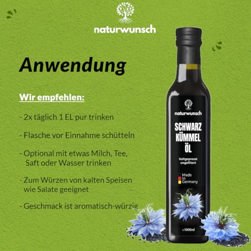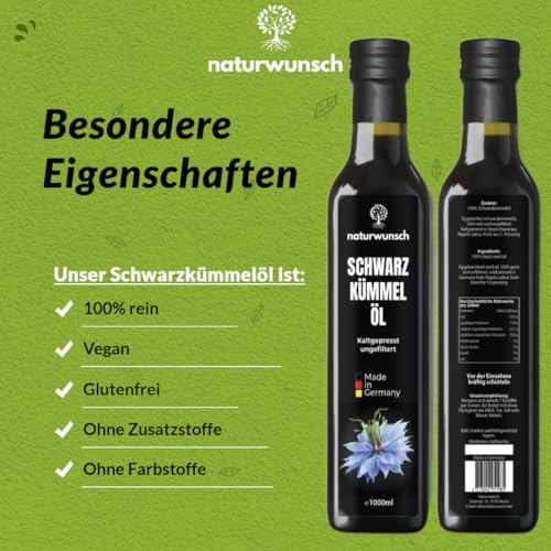 naturwunsch Aceite de comino negro, 1000 ml, sin filtrar, prensado en frío, fabricado en Alemania, semillas egipcias Nigella sativa