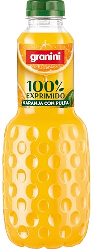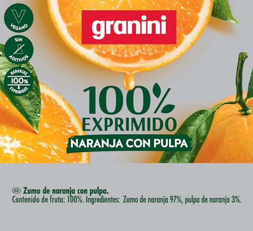 Zumo de naranja con pulpa con un contenido de fruta: 100%. 100% granini! Si por algo es conocida la naranja es por su alto contenido en vitamina C, nutriente esencial para combatir infecciones y aumentar la absorción de hierro, calcio y fósforo. Además, esta fruta también es digestiva por su fibra y refuerza el sistema inmunitario gracias a sus vitaminas y flavonoides. Naranjas cultivadas en el campo, maduradas al sol, recogidas en su punto para conseguir un sabor 100% único y delicioso. ¡Disfruta en casa del delicioso sabor de las naranjas con nuestro zumo 100% fruta de Granini! Sin azúcares añadidos ni aditivos artificiales, Solo fruta!!!